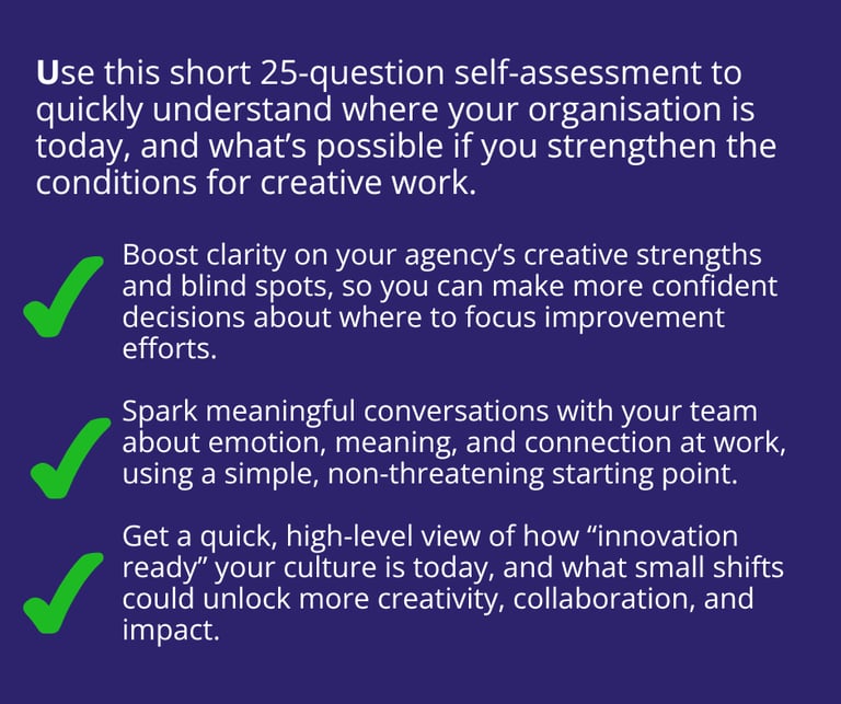 A practical workshop that starts with the mindset shift and then gets teams working directly to identify how to cultivate creativity within their teams and across their agencies.